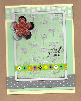 The base cardstock is actually a pale peach from a multicolor pack from Astrobrights/Neenah. So the border sticker was picked because it has an orange posy in its repeat and I had the deep orange glitter posy stick-on to give more orange to this mostly gray and sage green card. I know the posies don't match the Queen Anne's Lace on the patterned cardstock but they were picked for their colors rather than their shape/type. :)